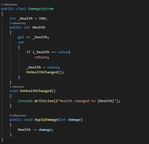 I think even as non programmer you can understand what the code is doing. We can see in the code a class is called DamageSystem and contains _health variable. In my case the underscore "_" indicates, we shouldn't not use that outside the property Health. We also see ApplyDamage and OnHealthChanged. I think from here it is self-explaining 😊. This means this script can be used for DamageSystems like player character get a hit by a bullet then ApplyDamage.